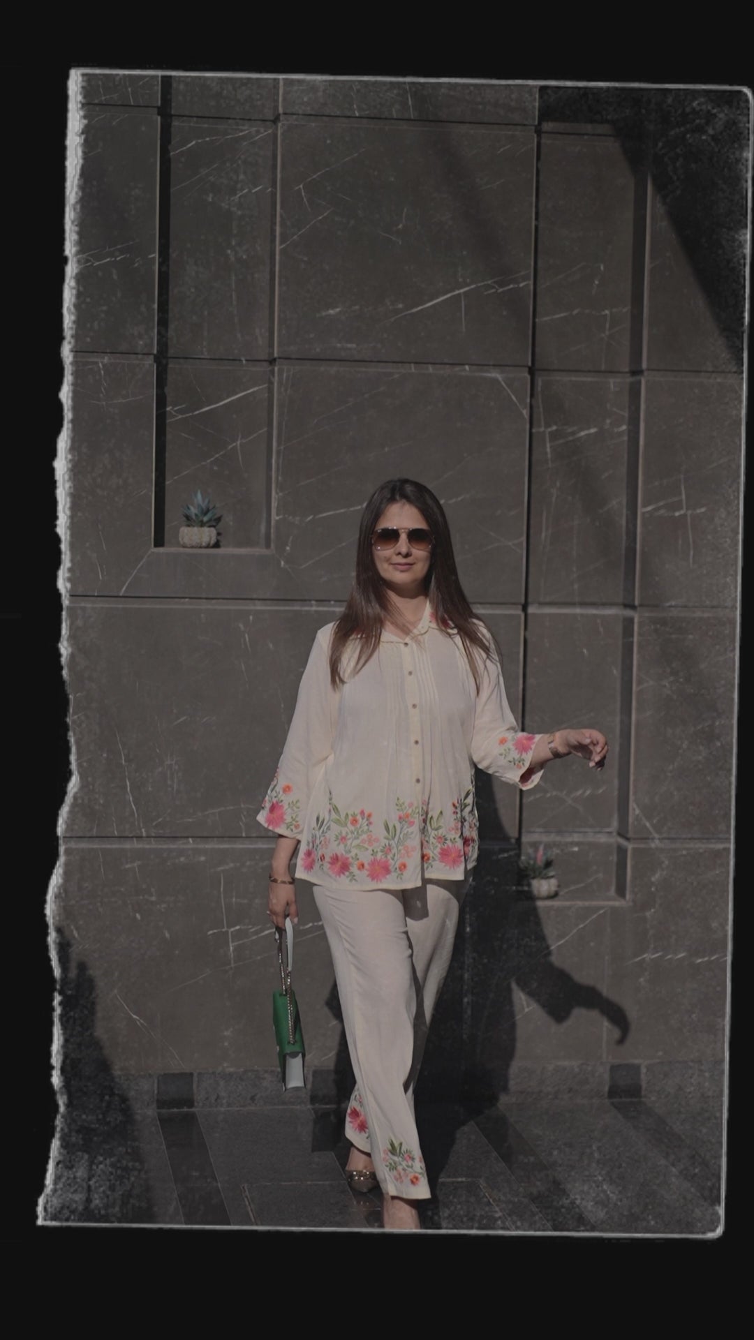 Step into effortless elegance with this ivory co-ord set, a perfect blend of comfort and sophistication. Crafted from soft, breathable fabric, the top features delicate pintuck detailing along the front and intricate floral embroidery in pink and green hues on the sleeves and hem. The straight-cut silhouette is finished with wooden-style buttons, giving it a refined, earthy charm. Paired with coordinated ivory pants, this ensemble is ideal for brunches, casual gatherings, or laid-back festive moments.